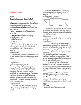 Ipaawit ang kantang Leron Leron Sinta b. Halo- halong emosyon ang aming nadarama sa araw na ito. Ang pagiging matiyaga ay may magandang maidudulot sapagat sa huli ay mayroon itong maidudulot na magandang bagayHalimbawa.