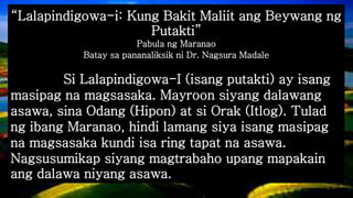 Pulong ng mga Hayop. Gumawa o bumuo ng isang patalastas na may kinalaman sasitwasyong kinakaharap natin sa kasalukuyan upang maiwasan ang pagkalatnito. Tulad ng ibang Maranao hindi lamang siya masipag na magsasaka kundi isang tapat na asawa.