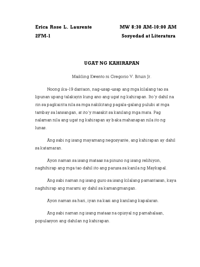 Ang kanyang ama ay isang magsasaka sa inuupahang lupa at. Hindi siya nakikinig sa ina niya at palagi siyang wala sa klase. Nilagyan rin namin ng aral ang bawat kwento upang.