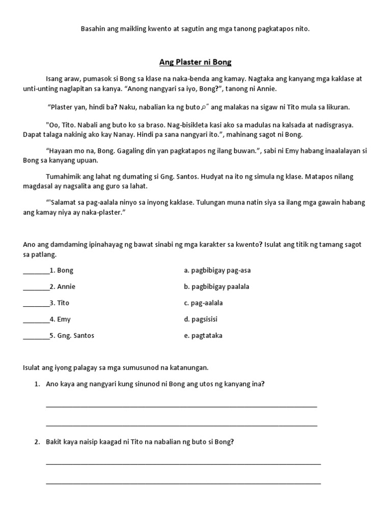 Kung para sa sarili kapwa o sa bayan niyay hindi na iyon mahalaga. Matagal na silang magkaibigan halos kalahati ng kanilang buhay ay sila na ang magkasama at kilala na nila ang isat isa. Maikling kwento sa grade 5 worksheets there are 8 printable worksheets for this topic.