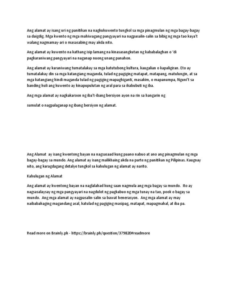 Alamat-ang alamat ay kabilang rin sa mga kwentong bayan na kathang isip na mga kwento tungkol sa pinagmulan ng isang lugar bagay at iba pa. Mga kuwento na maaring totoo o hindi 4. Dokumento na nagpapakita ng pinagmulan ng isang lugar bagay o institusyon 3.