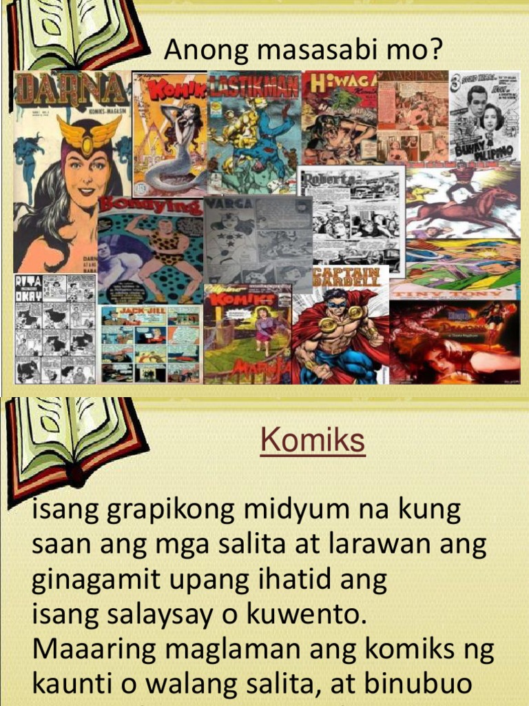 Ay isang uri ng panitikan na naiiba sa ibang uri ng panitikan dahil ang komiks ay bukad sa naglalaman ng kwento naglalaman din ito ng mga larawan ng pangyayari na nagmumula sa kwento. The characters the setting the plot the point of view the theme the conflict and the resolution.