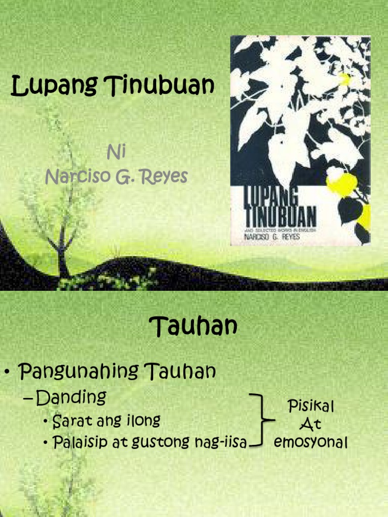 Lupang Tinubuan Maikling kwento ni Narciso G. Ang buong maghapoy tuwang di-matapos Sa piling ng iyong kababayang irog. Sa kwentong ito ipinakita ang mga suliraning kinahaharap ng pangunahing tauhan ang kung.