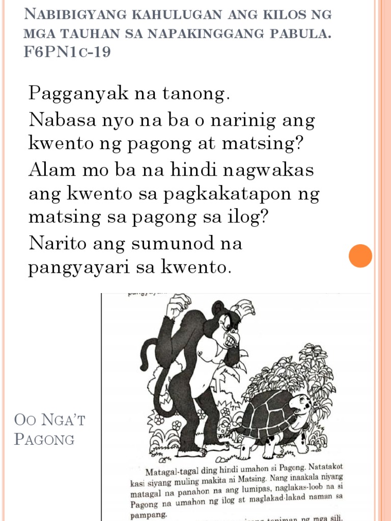 Kaligirang Pangkasaysayan ng Pabula Ang Matsing at ang Pagong Ibat ibang Paraan ng Pagtatanong PAKSA. Ang Pagong At Ang Kuneho. Si Pagong naman ay natuwa nang makita ang umuusbong na dahon sa puno ng saging.