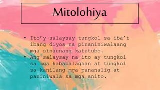 MITO ito ay mga kwento tungkol sa mga diyos at diyosa. ALAMAT - Akda na ang laman ang mga kwento tungkol sa pinagmulan ng mga bagay-bagay sa mundong ibabawa. MitoAng mito ay mga kwento tungkol sa bathaladiosahari o mga reynaito ay tungkol din sa mga pinagmulan ng isang bagay o pangyayariIbang kasagutanMga kwentong kathang isip lamang o gawa-gawa tulad ng mga alamat.