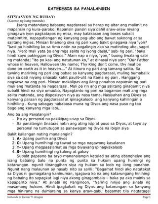 Kwento tungkol sa panalangin. Pinahihina ng hindi pananalangin ang ating kakayahan na pakinggan si. Hindi parin ako nawawalan ng pag-asa alam ko na habang may buhay may pag-asa kaya nakapag-aral ako ngayon dahil sa pagsisikap ng aking ama. Tagisan ito ng talino sa pagbigkas ng tula bilang pangangatwiran sa isang paksang pagtatalunan.